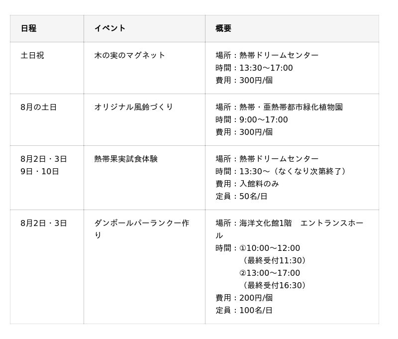 そのほか、昆虫展示・藍染体験など、夏休みの自由研究にピッタリなイベントが充実!