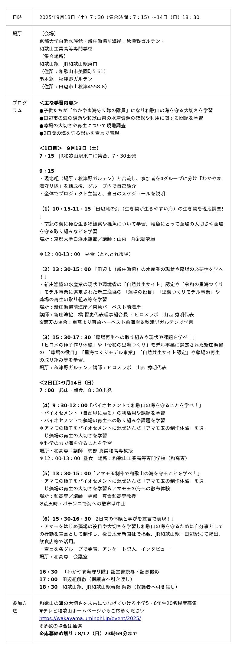 一般社団法人海と日本プロジェクトin和歌山県は、次世代を担う子どもたちに「和歌山の海」の美しさや、海を守ることの大切さを再認識してもらうことを目指し9月13日(土)から14(日)の2日間に白浜町・田辺市・御坊市で「紀南の海が未来を変える~わかやま海守り隊2025~」を開催いたします。紀南地方で起こっている海の危機について、新庄漁協の現状や藻場の保全活動や藻場再生への取り組みなどを学び、アマモの種子作りなどの体験を通して学んでいきます。
