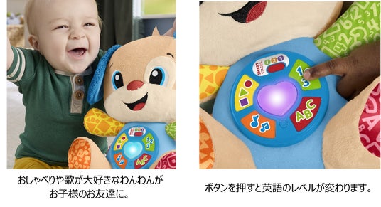 ふわふわの手触りで、ずっと抱きしめていたくなる、歌やおしゃべりが大好きなわんわんのぬいぐるみです。からだのボタンを押すと、ハート型ライトがカラフルに光って、80種類以上の歌、音、フレーズを日本語と英語でおしゃべりします。ボタンを押すと、ABCの歌をうたったり、色と形をおしゃべりしたりします。レベル2はクイズ形式、レベル3はごっこ遊びと、レベルごとに、歌、メロディ、サウンドやフレーズが異なり、年齢や発達段階にふさわしい内容を楽しめます。