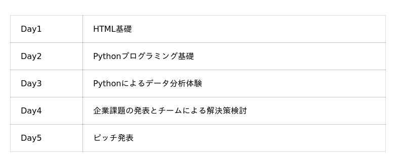 - 前半はHTML、Python、データ分析の基礎を学び、後半は企業が提示するリアルな課題にAIを活用して解決策を立案