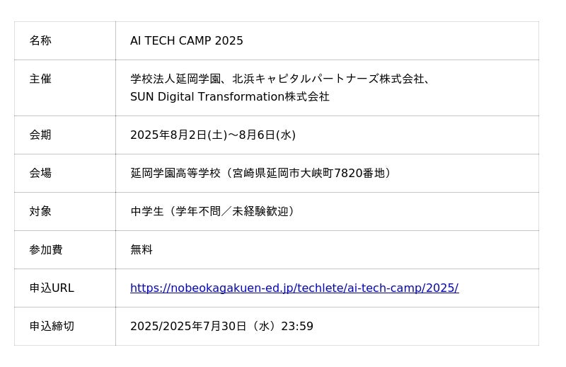 学校法人延岡学園と北浜キャピタルパートナーズ株式会社、SUN Digital Transformation株式会社は、2025年8月2日(土)~8月6日(水)の5日間、中学生を対象としたAIエンジニア体験プログラム「AI TECH CAMP 2025」を延岡学園高等学校にて開催します。