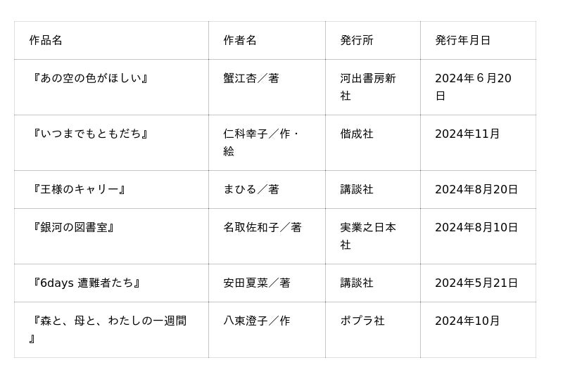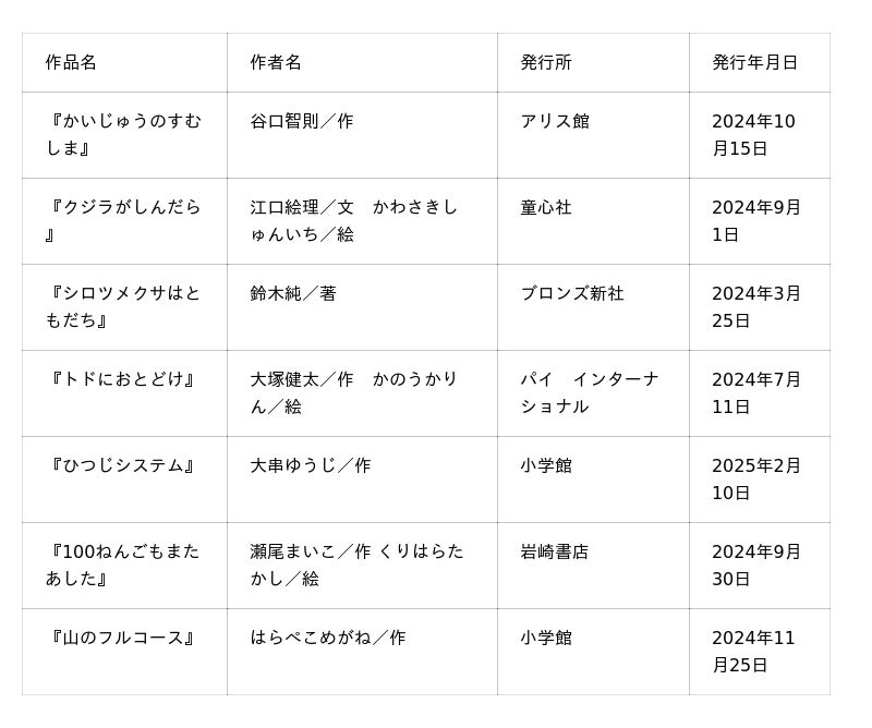 今回は、2024年3月から 2025年2月までに発表された、絵本、童話・児童文学、その他の出版物(翻訳・キャラクター・コミックスなどは除く)で、幼年ならびに少年少女に推薦したい優れた作品を対象として、審査委員・作家・画家・写真家・書評家・出版社・新聞社・児童文化団体・図書館・書店・読者から推薦を募り、作品を収集しました。児童出版文化賞事務局内の委員会にて予選を行い、以下の作品が今年度の候補作となりました。