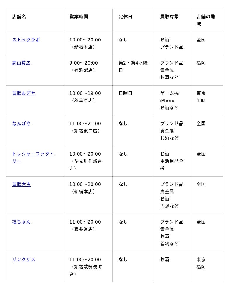 では、響買取におすすめの業者紹介に進みましょう。以下は、今回お伝えする業者と主要情報を一覧にまとめたの表なので、まずはこちらからご覧ください。