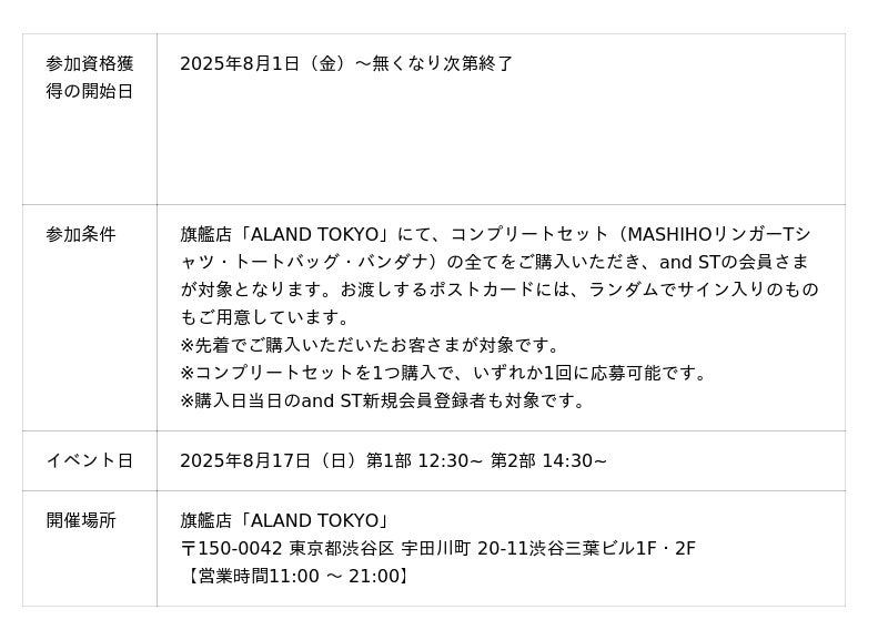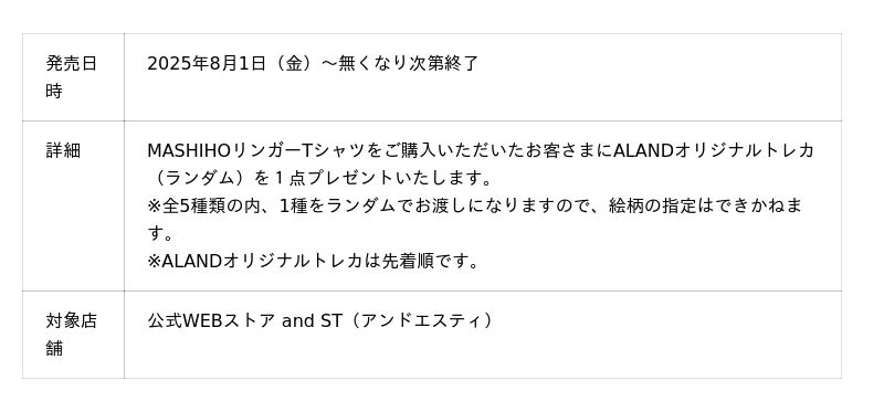 株式会社アダストリア(本部:東京都渋谷区渋谷2-21-1、代表取締役社長:木村 治)が展開する韓国発のセレクトブランドALAND(エーランド)は、世界的に人気がある日本出身のソロアーティスト「MASHIHO(マシホ)」の初のツアー「ULTRA VIOLET」の公式グッズをプロデュースいたしました。これを記念して、2025年8月1日(金)よりALAND全店と公式WEBストア and ST(アンドエスティ)にて先行発売を行います。公式WEBストア and STでは、ツアーグッズのTシャツをお買い上げ頂いたお客さまに、全5種類のALAND限定オリジナルトレーディングカードを1枚プレゼントする他、旗艦店「ALAND TOKYO」(東京・渋谷)では、ツアーグッズ(Tシャツ・トートバッグ・バンダナ全て)をご購入いただいたお客さまに先着で、2025年8月17日(日)に開催するMASHIHO本人に会える、ALAND限定の撮りおろしポストカードのお渡し会に参加いただける特典をプレゼントいたします。お渡しするポストカードには、ランダムでサイン入りのものもご用意しています。