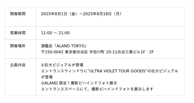 ■”ULTRA VIOLET TOUR GOODS” 「ALAND TOKYO」店限定のPOPUPについて