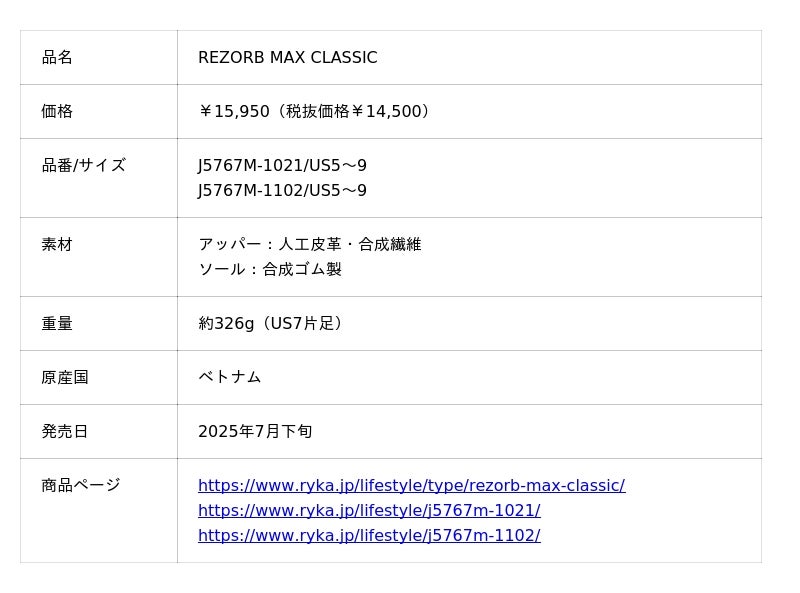 ゼット株式会社(本社/大阪市天王寺区、代表取締役社長/渡辺裕之)が取り扱う『ryka』(ライカ)ブランドより、カジュアルなデザインと2層の厚底ソールが特徴のウォーキングスニーカーのNEW MODEL【REZORB MAX CLASSIC】(リゾーブ マックス クラシック)を2025年7月下旬に発売しました。