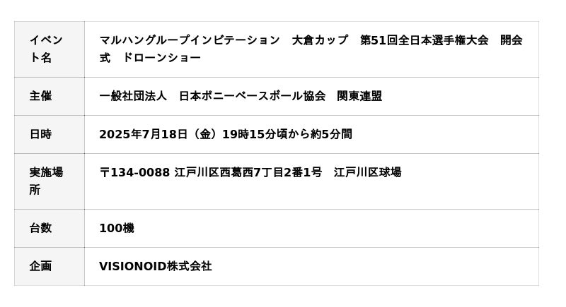 VISIONOID株式会社(東京都港区、代表取締役:竹中悠満、以下「VISIONOID」)は、2025年7月18日(金)、東京都・江戸川区球場にて開催された「マルハングループインビテーション 大倉カップ 第51回全日本選手権大会 開会式」(主催:一般社団法人 日本ポニーベースボール協会 関東連盟)において、都市型低空100機によるドローンショーを実施いたしました。