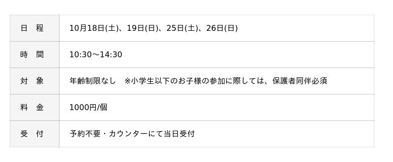 ジャックオーランタン型のハロウィンバスケットを作るワークショップです。完成したバスケットは当日のパレードで実際に使用可能。親子でハロウィンの思い出作りにもおすすめです。