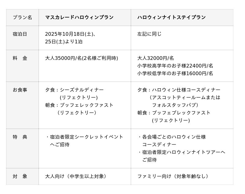 2種類のハロウィン特別宿泊プランをご用意しております。マスカレードパーティー(仮面舞踏会)をテーマにした「マスカレードハロウィンプラン」では、宿泊者限定のシークレットイベントを開催いたします。シークレットイベントは予測不能なタイミングで突如始まり、参加者の皆さまに緊張感あふれる体験をお届けします。ハロウィンナイトステイプランは、お子様連れのご家族にぴったりな特別宿泊プランです。ハロウィン仕様のコースディナーや、子どもも大人も参加できるハロウィンナイトツアーをご用意しております。
