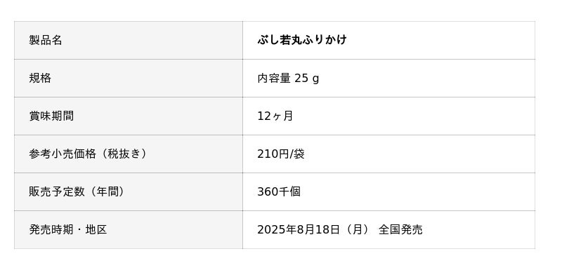 「ぶし若丸ふりかけ」は、当社自慢の“味かつお”をたっぷり使い、かつお節本来のおいしさが堪能できる、食べ応え抜群のふりかけです。顆粒を使わず、当社のふりかけ製品の中で最も“味かつお”を多く配合していることから、かつお本来の旨みも楽しめるふりかけです。