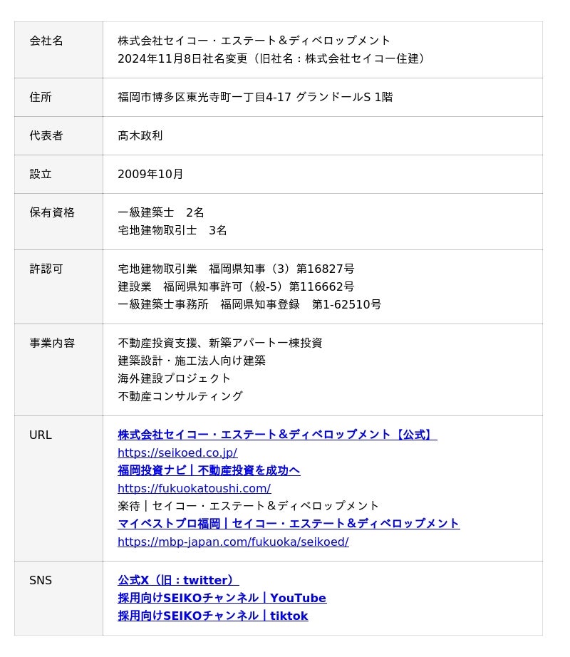 株式会社セイコー・エステート&ディベロップメントは、福岡市博多区を拠点に不動産投資支援と建築事業を展開しています。土地仕入れから融資戦略、建築プラン、施工、入居者管理までをワンストップで提供し、投資家の資産形成を伴走型で支援することを理念としています。福岡エリアでの不動産投資において、「投資家目線に立ったアパート建築会社」として、多くの投資家から高い信頼をいただいております。