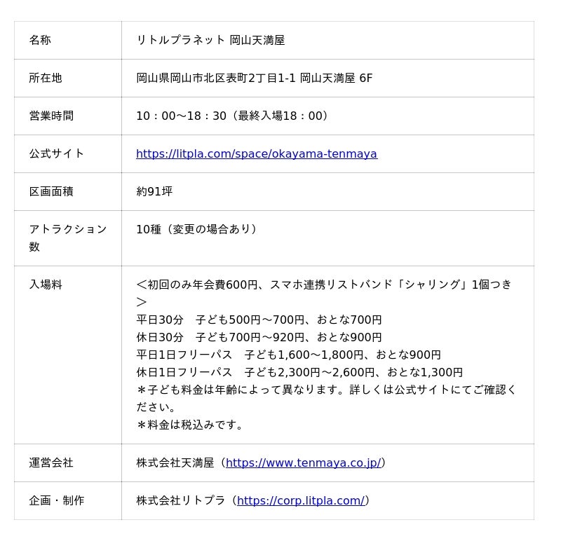 パーク公式サイト:https://litpla.com/space/okayama-tenmaya/