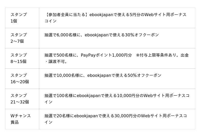 出版社ごとに週替わりで特集し、人気作品の全話無料や複数巻無料、PayPayポイント付与やセット割キャンペーンなど、各種イベントを実施します。その他にも、抽選で最大5,000円分のPayPayポイントが当たるSNSキャンペーンや、抽選でWebサイト用ボーナスコインやクーポンが当たるスタンプラリーなど、様々なイベントを予定していますので、ぜひ「ebookjapan 夏祭」特設ページをご覧ください。