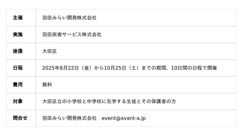 羽田空港第3ターミナルから1駅の天空橋駅に位置するホテルメトロポリタン 羽田(運営/日本ホテル株式会社 総支配人/塩原 健)は、 地域連携の一環として、当ホテルが入居する羽田イノベーションシティと羽田空港にて開催される「HICityスクール2025」に、協力企業として2年連続で参加します。 本イベントは、大田区立の小学校と中学校に在学する生徒とその保護者の方を対象としており、羽田空港を知り、羽田イノベーションシティで先端技術や文化を体験していただくことを目的に、様々な体験型イベントを2025年8月22日(金)から10月25日(土)までの期間、10日間の日程で開催されます。