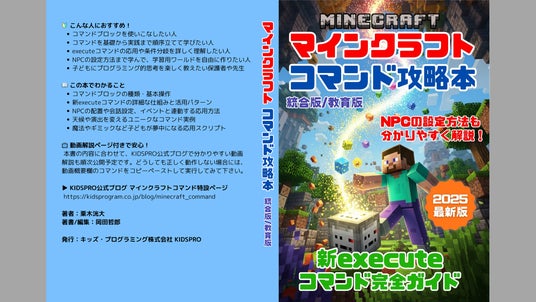 小中学生向けプログラミング教室を運営する キッズ・プログラミング株式会社(KIDSPRO/本社:東京都荒川区、代表:岡田哲郎) は、マインクラフト統合版・教育版に対応したコマンド解説書 『【最新版2025】マインクラフト コマンド完全攻略技術書〈統合版/教育版対応〉』(プリント・レプリカ版 Kindle)をAmazon にて販売開始しました。新 execute コマンドを含む主要コマンドと NPC 活用術を 340 ページで徹底解説し、授業でも使える実践的な内容に仕上げています。