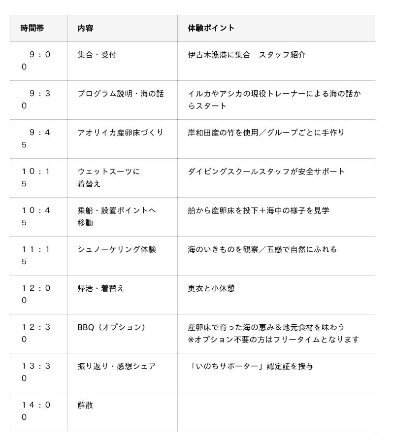 ※未就学児も保護者同伴で無料参加が可能ですが、体験プログラム(シュノーケリング等)には参加いただけません。またツアー中は、未就学児のお子さまに保護者(大人)の方の付き添いをお願いします。