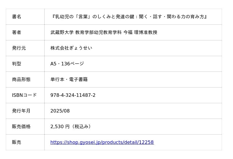 【武蔵野大学】教育学部幼児教育学科 今福 理博准教授の新刊が発行!子どもの「言葉」はどう育つ?保育者のための発達心理学×実践ガイド『乳幼児の「言葉」のしくみと発達の鍵 聞く・話す・関わる力の育み方』