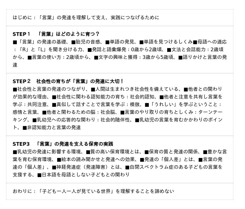 本書には、保育士、幼稚園教諭、巡回相談員など11名の専門職による、子どもの「言葉」の発達にまつわるコラムを収録しています。「こんなとき、どう寄り添う?」「言葉にならない気持ちをどう受けとめる?」そんな日々の問いに寄り添うエピソードと実践知をご紹介します。