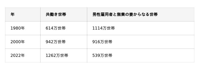 厚生労働省の調査によると、日本の共働き世帯はこの40年間で2倍以上に増加し、2022年には約1,262万世帯にのぼります。