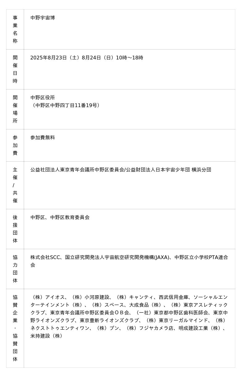 公益社団法人東京青年会議所中野区委員会は、2025年8月23日(土)と24日(日)の2日間、中野区役所(中野区中野四丁目11番19号)にて「中野宇宙博」を開催します 。