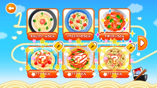作りたいアレンジうどんレシピのステージを選択すると、調理に使用する食材が画面に表示されます。その後、同じ食材同士をうどんで繋げながら、おいしいアレンジうどんを完成させていくゲームです。