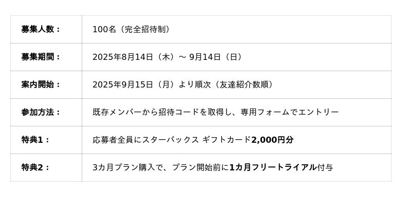 友達紹介数で優先案内/応募者全員にスタバ2,000円ギフト+3カ月プラン購入で開始前1カ月フリートライアル