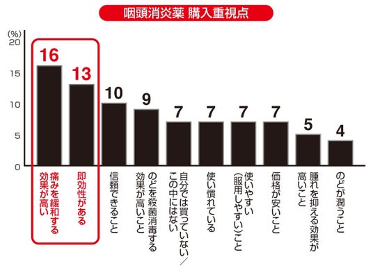 当社調査*¹より、咽喉消炎薬に最も期待されているのは、痛みの緩和と即効性でであることが明らかになりました。(図1)一方で既存ののど飴やトローチではこれらの効果に不満を抱えている方が多いことも分かりました。*²そしてこの度、10年以上の歳月をかけて、のどの痛みへの即効対処と炎症への根本対処を同時に行う「のどぬ~る鎮痛ドロップ」を開発しました。今後も、「頑張るあなたをのどの痛みから守る」というスローガンのもと、みなさまのニーズにお応えし、快適な生活をサポートする製品を展開してまいります。