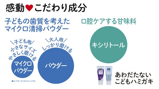 「あわだたないこどもハミガキ」は、発泡剤不使用で子どもの大好きな香味(ぶどうとラムネ)。磨いたときに違和感の少ないことが魅力です。子どもの歯質を考えたやさしく磨けるマイクロ清掃パウダーを採用し、口腔ケアする甘味料のキシリトールを配合。口に入れるものだから食品にも使われる成分で処方し、着色料や保存料は無添加。控えめな清涼感です。自然と歯磨き習慣を育み、仕上げ磨きから自分磨き、そして大人用ハミガキへの移行もスムーズに(※3)。歯磨き後に味を損なわない(※4)ので、食育にもつながります。