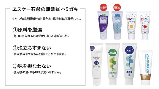 合成界面活性剤・着色料・保存料不使用の無添加ハミガキは、生活協同組合との共同開発により1983年に誕生。その後、ファミリー向けだけでなく、薬用、子ども用など各種発売しました。きちんと磨けること、すすぎも簡単なこと、使用後に味を損なわないことが魅力で、男女問わず、幅広い世代に人気です。