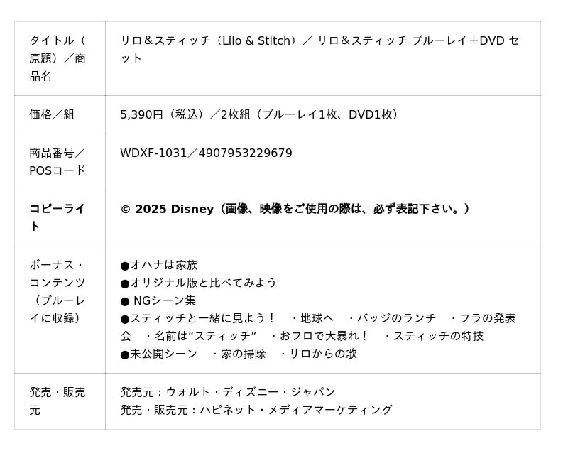 『美女と野獣』『アラジン』をはじめ、数々のアニメーション映画の実写化を成功させてきたディズニーが、その愛らしさで空前のスティッチ・ブームを巻き起こしたアニメーション版を完全実写化した映画『リロ&スティッチ』を、2025年10月15日(水)にブルーレイ+DVD セット、4K UHD+ブルーレイ セットで発売いたします。