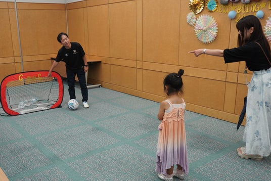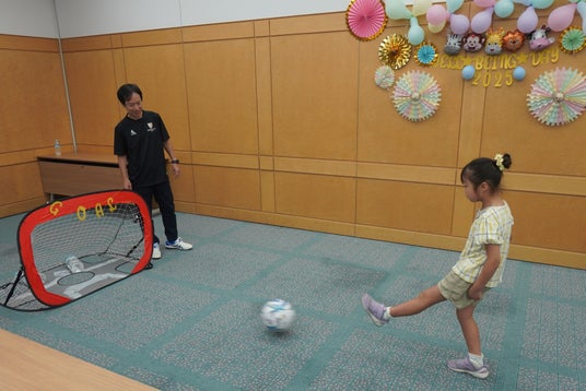 サッカー経験者の隅野の発案により、昨年から実施しています。子どもたちが隅野と名刺交換したり、隅野からのパスを受けてゴールを狙うなど、年少の子どもも楽しめる内容としました。最後には参加者一人ひとりと記念撮影を行い、思い出に残るひとときとなりました。
