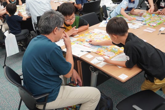 弊社作成の消費者教育・金融保険教育教材「ライフサイクルゲームIII~生涯設計のススメ~」は、子どもたちの金融リテラシー向上に寄与するだけでなく、大人も真剣に楽しめる内容となっており、親子で熱心に取り組む様子が見受けられました。