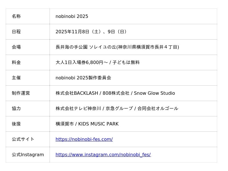 合同会社オルゴール(本社:東京都港区 代表:広瀬基樹)が、プロデュース協力を行う家族向けフェス「nobinobi 2025」の開催をお知らせします。