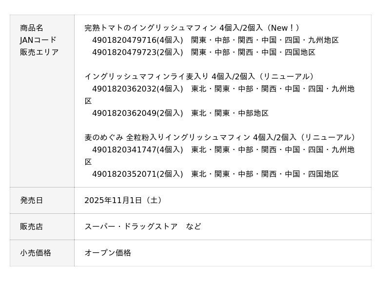 敷島製パン株式会社(Pasco)は、「イングリッシュマフィン」シリーズの新商品として「完熟トマトのイングリッシュマフィン 4個入/2個入」を、2025年11月1日(土)から関東、中部、関西、中国、四国、九州地区にて発売します。また、同日に「麦のめぐみ 全粒粉入りイングリッシュマフィン 4個入/2個入」「イングリッシュマフィンライ麦入り 4個入/2個入」をリニューアル発売します。