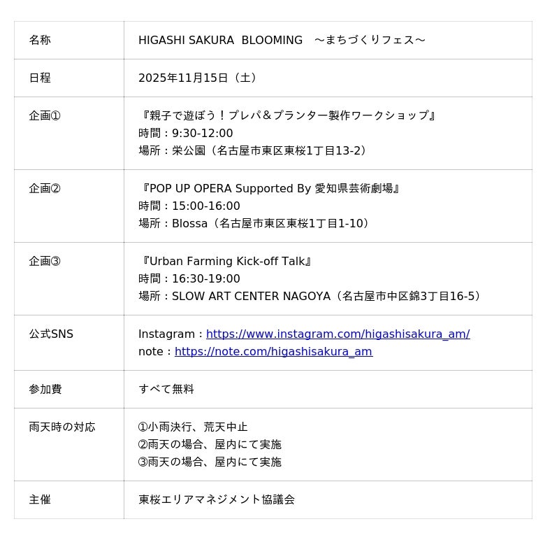 東桜エリアマネジメント協議会(事務局:NTTアーバンソリューションズ株式会社(本社:東京都千代田区、代表取締役社長 池田 康)、以下「当団体」)は、まちなかに新たな活動の場を創出する社会実験『HIGASHI SAKURA BLOOMING ~まちづくりフェス~』を、2025年11月15日(土)に実施します。これは、名古屋市栄地区に位置する東桜エリアの価値向上をめざした、まちづくり活動の一環として行われます。