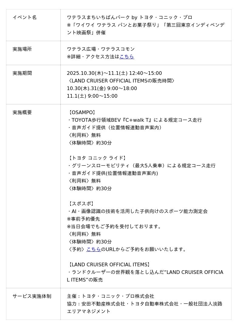 トヨタ・コニック・プロ株式会社(本社:東京都千代田区、代表取締役社長:武田 淳一郎、以下「トヨタ・コニック・プロ」)は、本社拠点を構える千代田区神田淡路町の地域活性・地域貢献を目的として、10/30(木)~11/1(土)に神田淡路町の複合施設ワテラスにて安田不動産株式会社(本社:東京都千代田区、代表取締役社長:安田 守)の協力のもと、4つの地域創生・地域活性ソリューションが体験できるイベント「ワテラスまちいちばんパーク」を開催いたします。