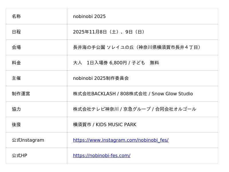 “親も子も夢中になれる、みんなが主役の2日間。”をテーマにしたファミリー向けフェスティバル「nobinobi 2025」は、神奈川県横須賀市・長井海の手公園 ソレイユの丘にて2025年11月8日(土)・9日(日)に初開催されます。主催は、子育て世代を中心にSNSで約180万フォロワーを持つ「つむぱぱ社」です。