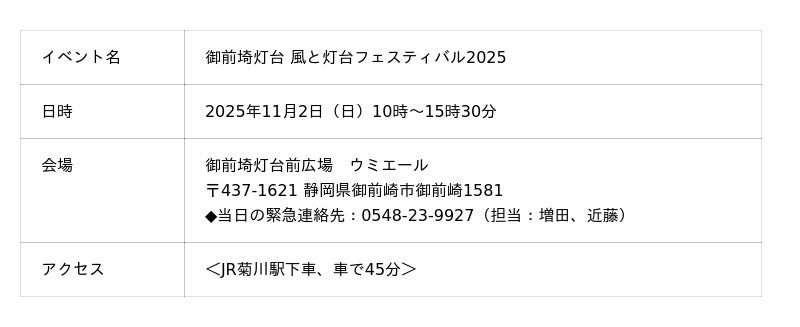 コンソーシアム ヒカリテラス御前崎は、2025年11月2日(日)に「御前埼灯台・風と灯台フェスティバル2025」を開催いたします。