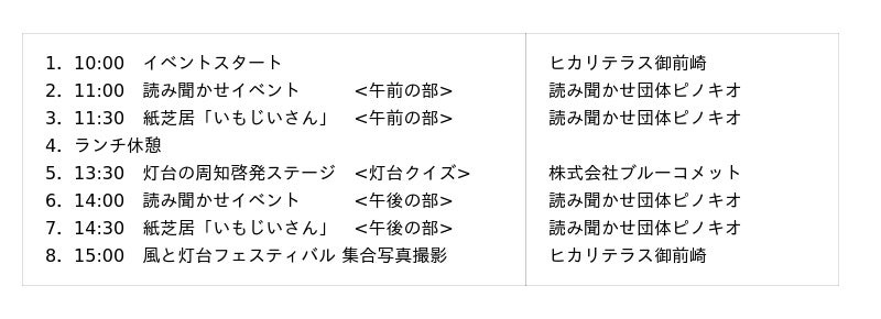 当イベントは御前埼灯台150周年の昨年2024年11月10日に第1回イベントを開催し、今年も御前埼灯台前広場で風車作りや紙芝居、読み聞かせなどのイベントに無料で参加いただけます。秋の1日を御前埼灯台や海を眺め、風を感じながら1日ゆっくり楽しめるイベントです。