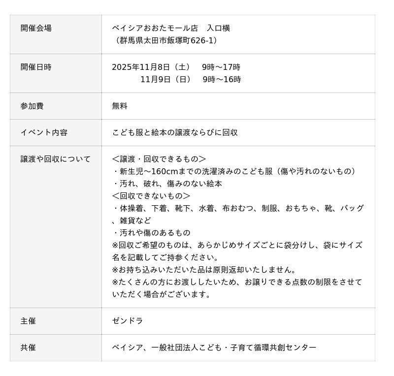株式会社ベイシア(本社:群馬県前橋市、代表取締役社長:相木孝仁)は、ベイシアおおたモール店にて2025年11月8日(土)・9日(日)に「こども服の譲渡会」を開催いたします。本イベントは、クリーニング業界紙最大手のゼンドラ株式会社(本社:東京都文京区、代表取締役:関 誠、以下「ゼンドラ」)が主催、ベイシアならびに一般社団法人こども・子育て循環共創センターが共催する、子育て応援や地域の資源循環への貢献を目指した取り組みです。