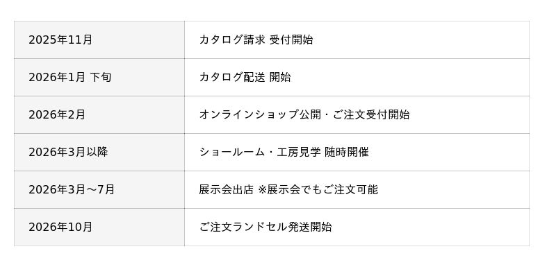 ごとうじゅうランドセルの2027年度モデルは、以下の販売スケジュールを計画しております。