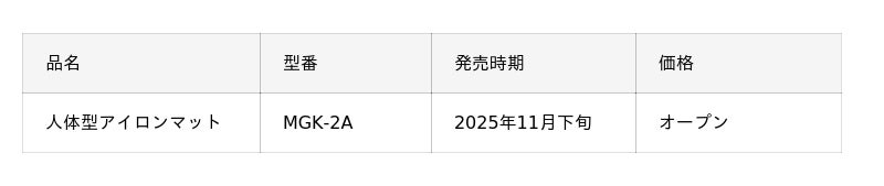 株式会社電響社(大阪市浪速区、代表取締役社⾧:山下 俊治)は、macaful(マカフル)ブランドから「人体型アイロンマット MGK-2A」を、2025年11月下旬より発売いたします。