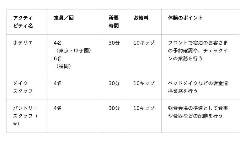 ※「パントリースタッフ」は、キッザニア東京・福岡のみ体験可能