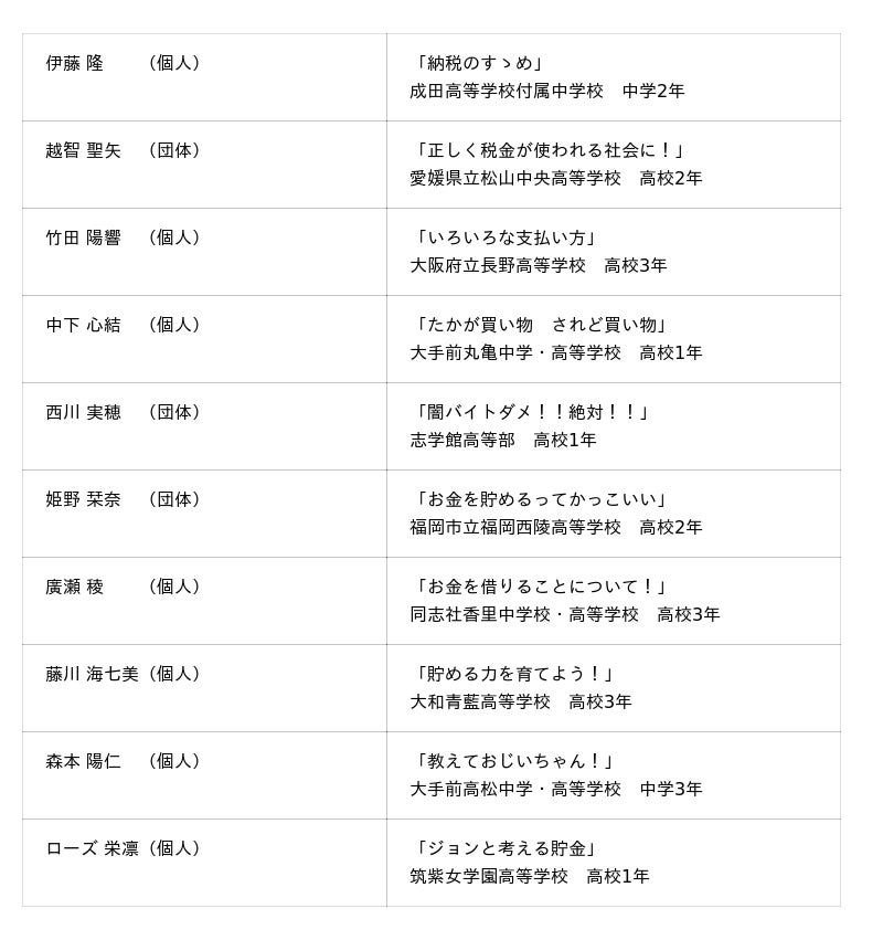 詳細は、公式ページ:「第3回 FESコンテスト Supported by ゆうちょ銀行」 全国大会ファイナリストと佳作を発表、をご覧ください。