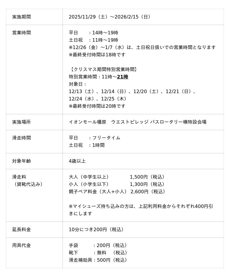 親子・子供のためのイベント企画運営会社の株式会社ワック(本社所在地:東京都品川区、代表取締役社長:栗橋 寿、以下ワック)は、イオンモール橿原(奈良県橿原市)にて、2025年11月29日(土)から2026年2月15日(日)までの期間限定で屋外アイススケートリンク「WONDER RINK」を初開催します。