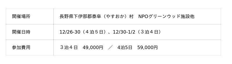 長野県の南端、南信州に位置する泰阜(やすおか)村で自然体験活動を提供するNPO法人グリーンウッド自然体験教育センターは、12/26-1/2に「冬の信州こども山賊キャンプ」を開催します。全国の小中学生を対象に、もちつきや焚火、そり滑りや山探検など、信州の里山で思い切り身体を使って遊びつくします。