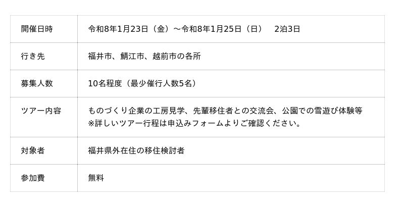 【福井県福井市】地方移住に興味のある方必見!福井市と丹南地域を巡る!2泊3日「移住体験ツアー」1/23~25開催|参加者募集中!
