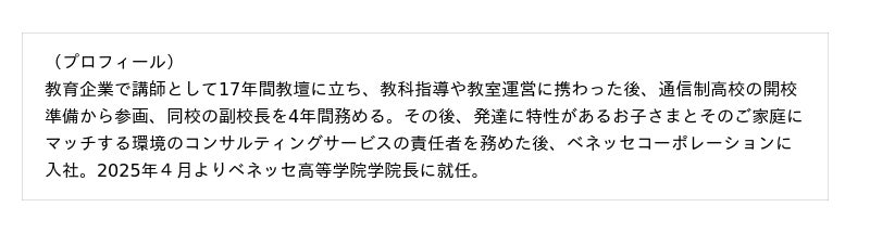 ベネッセ高等学院は、本事業を通じて、学びの多様性に対応し、子どもたち一人ひとりが自分らしい学びの場と学び方を選び取り、将来の可能性を大きく広げていくことを支援してまいります。