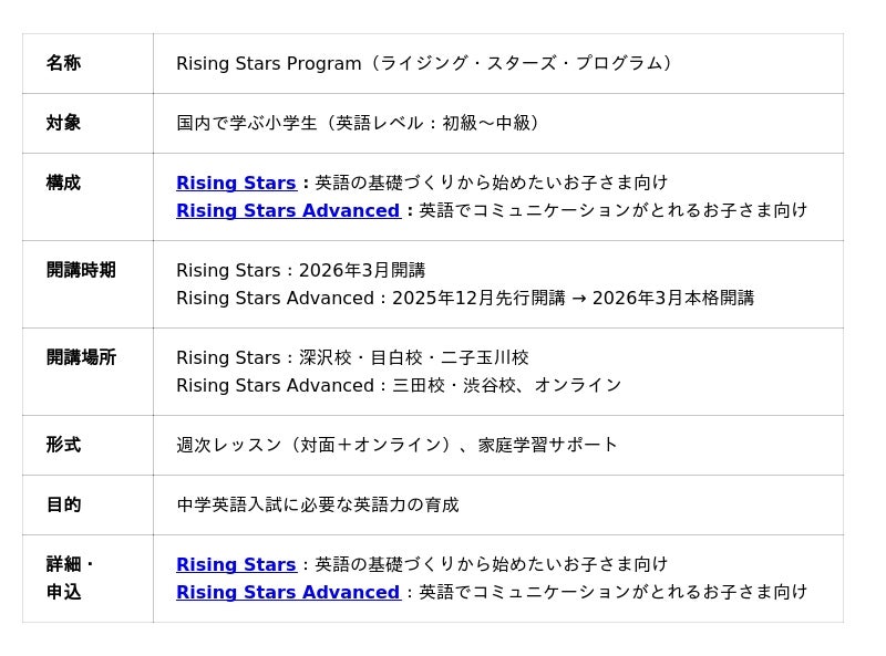 英語でコミュニケーションがとれるお子様向けの Rising Stars Advanced は 12月に先行開講します(本格開講は2026年3月)。また、英語初級者向けの Rising Stars は 2026年3月に開講いたします。いずれのコースも開講初年度のため、満席になり次第、受付を終了いたします。
