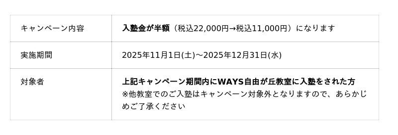 今回の拡大移転を記念した「入塾金無料キャンペーン」を、ご好評につき引き続き実施しております。期間内のご入塾で、通常22,000円の入塾金が無料となる大変お得な機会です。12月31日(水)までの期間限定ですので、この機会にぜひ無料学習相談へお越しください。